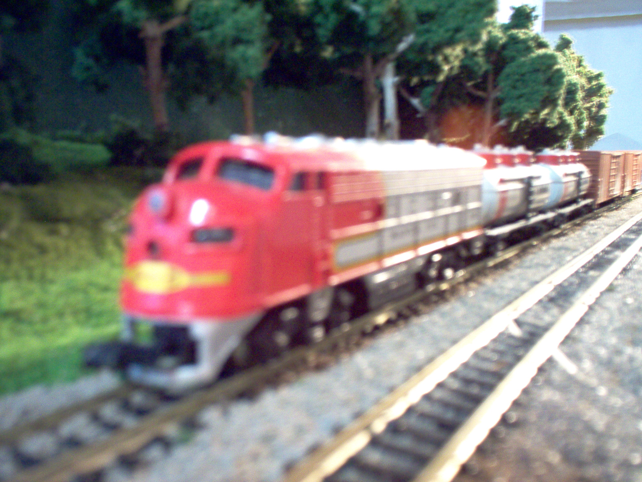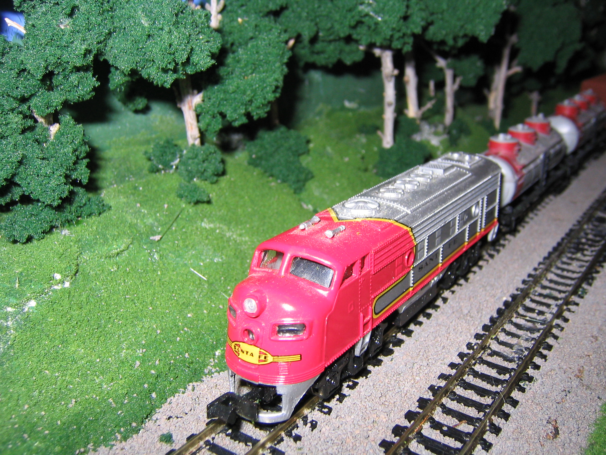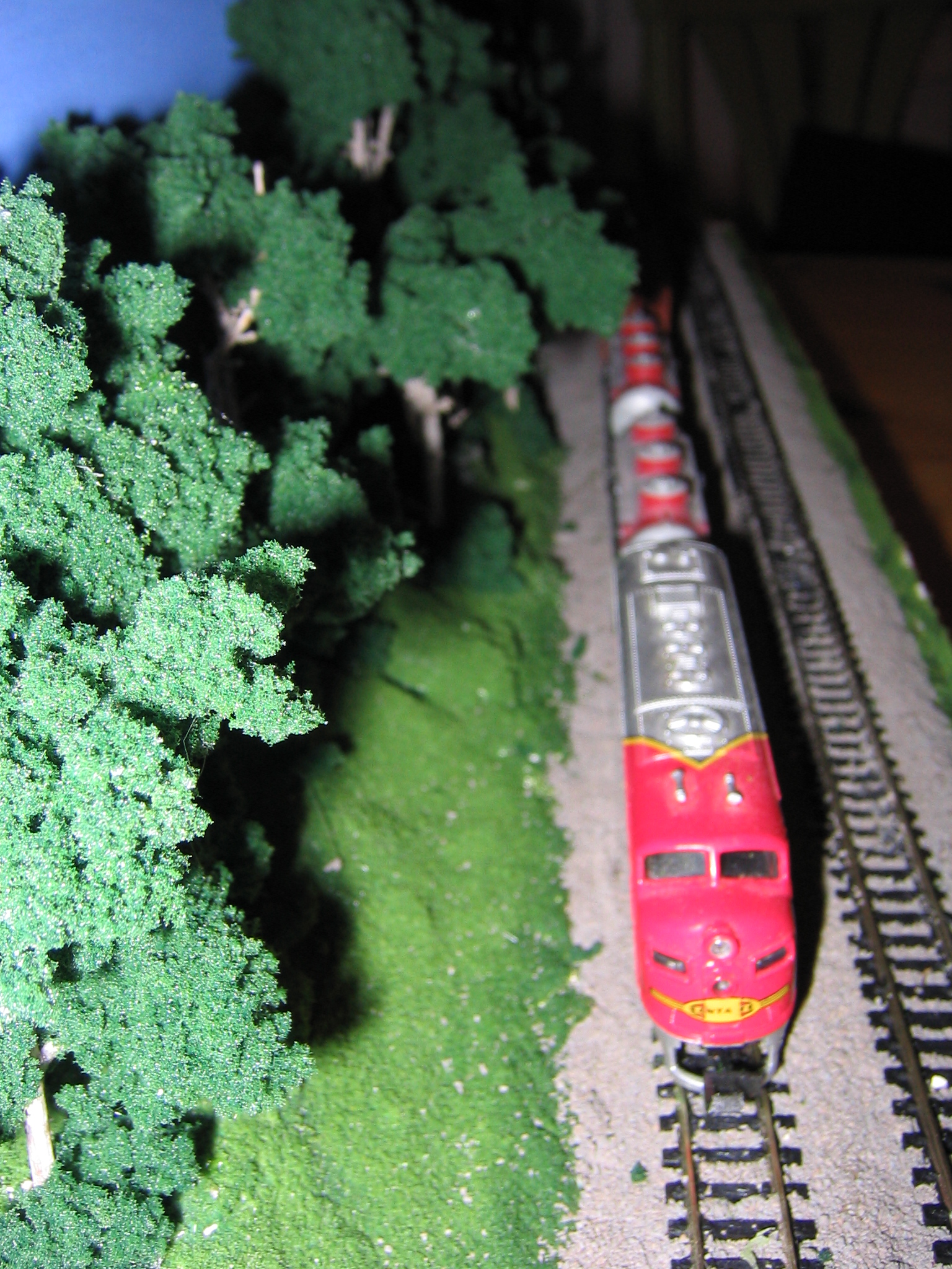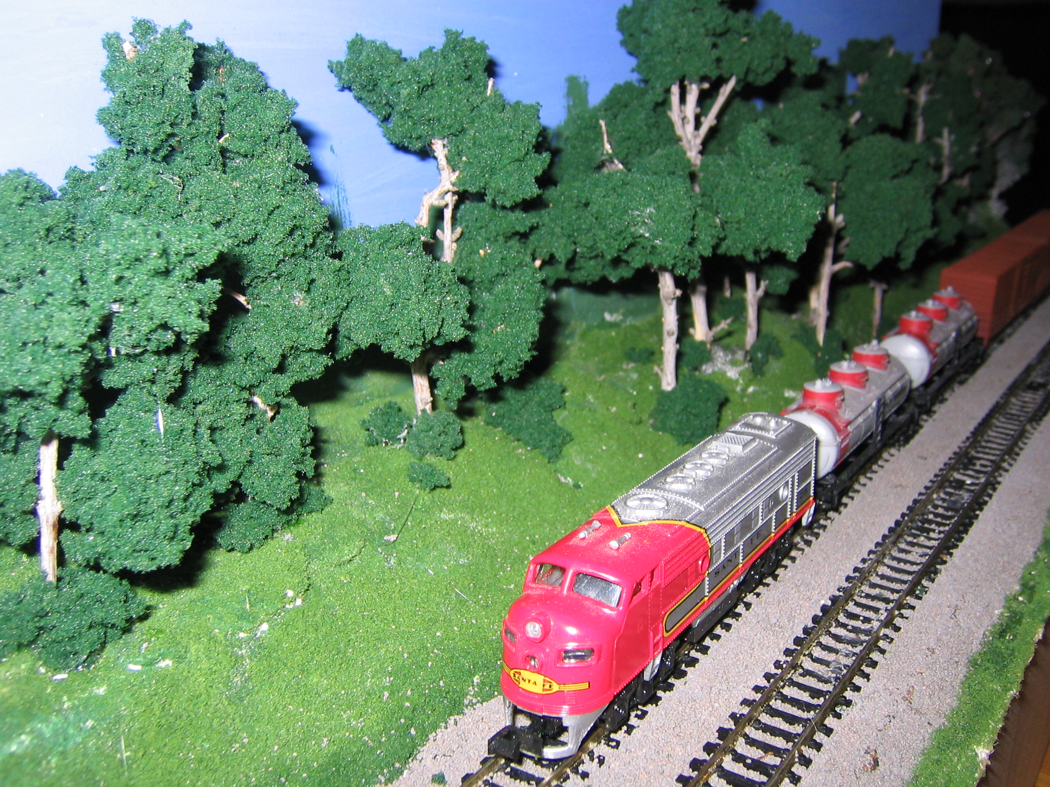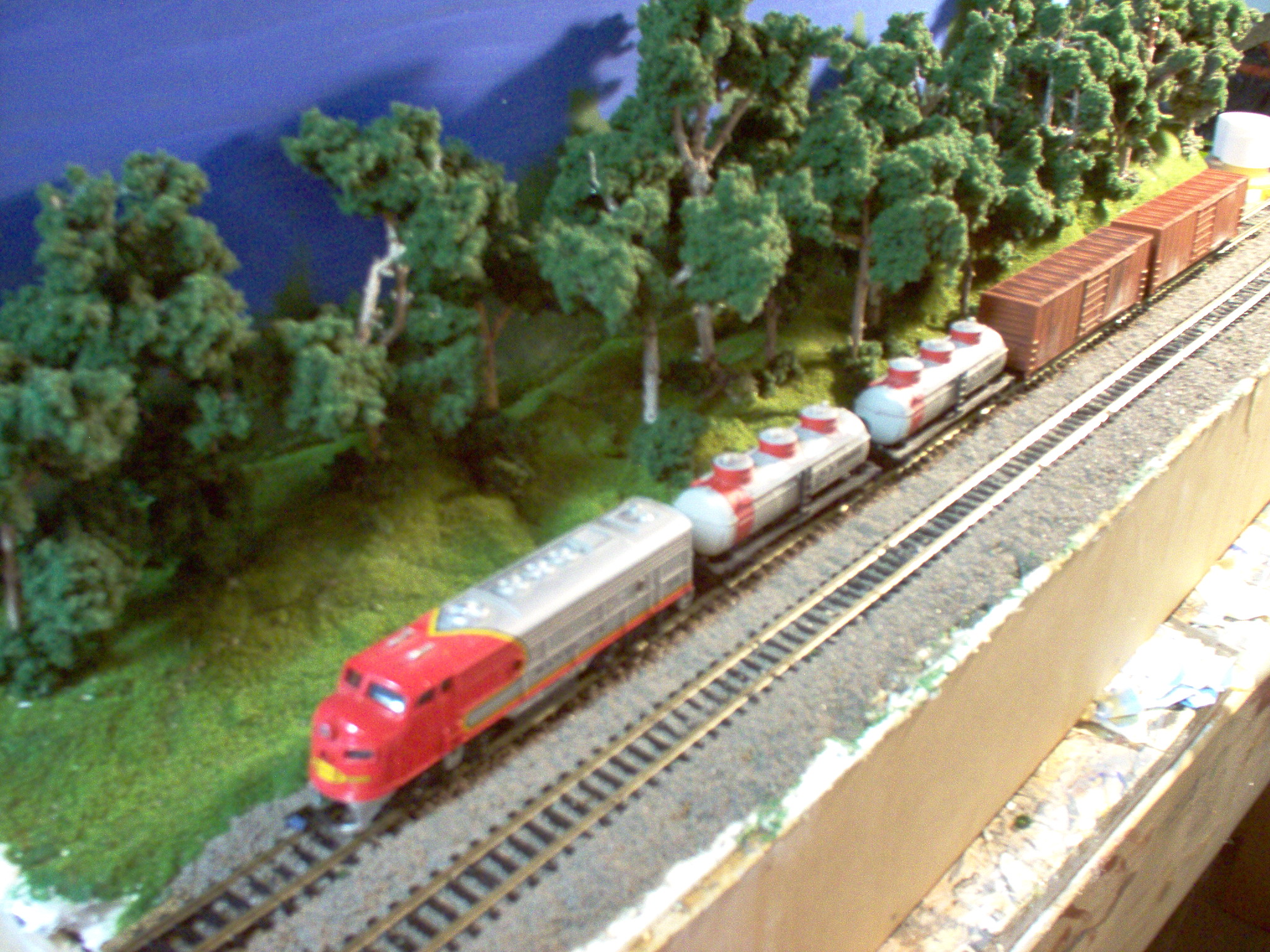 My Layout just got started a couple of months ago so its not very big yet but its turned out good so far. I built the table that it is built on entirely out of pieces I scrounged from construction sites. The basic plan I have for my lacout is that I want it too be a two track main line with loops on both ends to ensure continuos running. One of the loops will include sidings and will be my staging yard. My entire railroad will be in N scale even though I havce a whole basemenbt to build it in. The main reason for this is that I dont have alot of money or a job so I am relying on luck and myu allowence to supply me with the supplies I need. The land will be modeled after the spessart region of Germany because I've always felt a fascination for european trains and every timne I visited my grandma in Laufach/Fronhoffen Germany I always sat and watched the trains cruise through the beutifull countryside. Right now the only train I have in my layout is a santa fe highballer. Yes I know it doewsn't fit but it sure fits my budget. I plan on getting some modern electric European Trains from tyhe sweetest store in town, Discount Trains in Shops at the Bluffs. All the foilage on my layout is a dark green since the are I am modeling is in a very wet and rainy climate where the trees grow up to 4 times the height of a train or more.