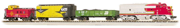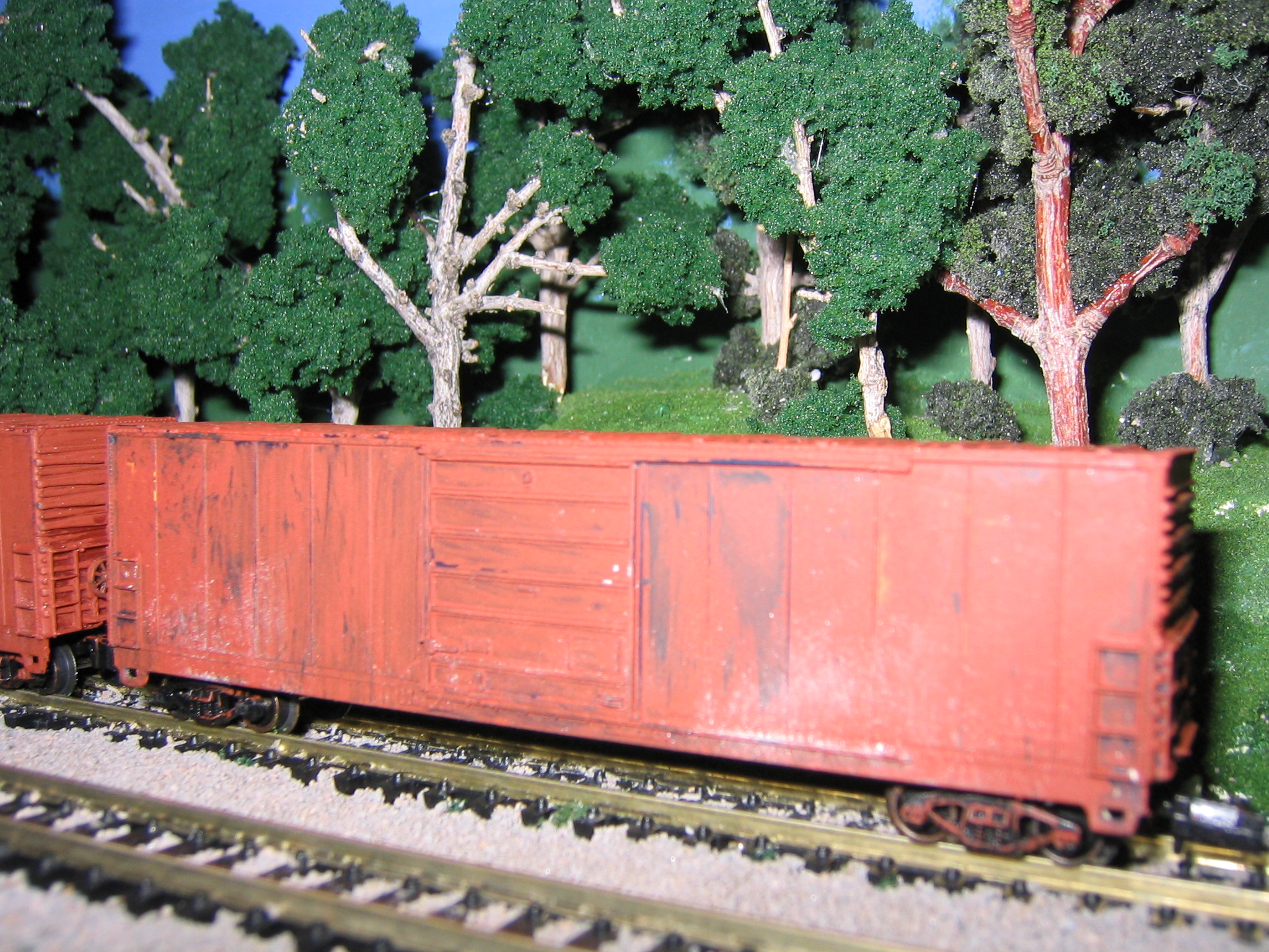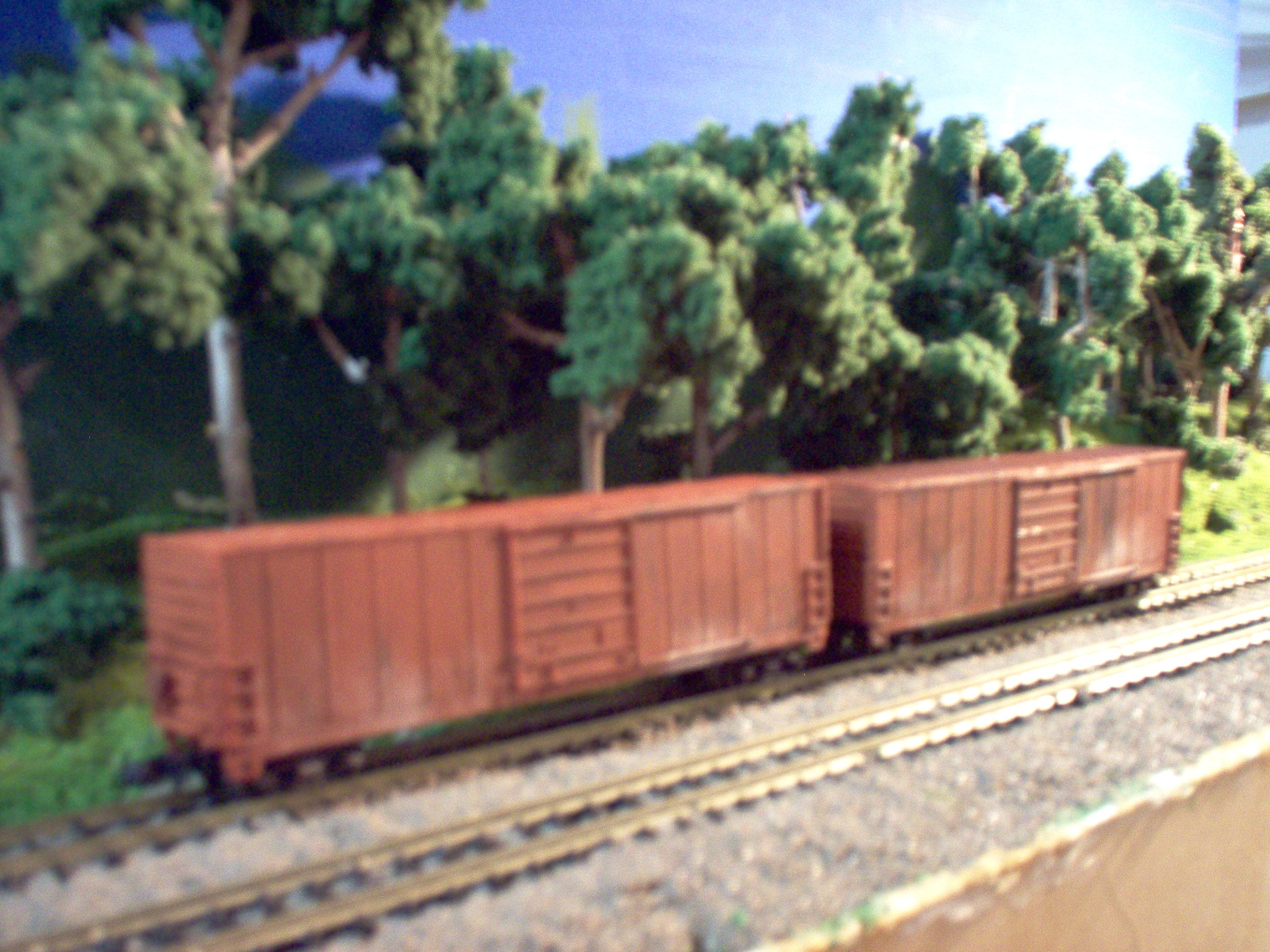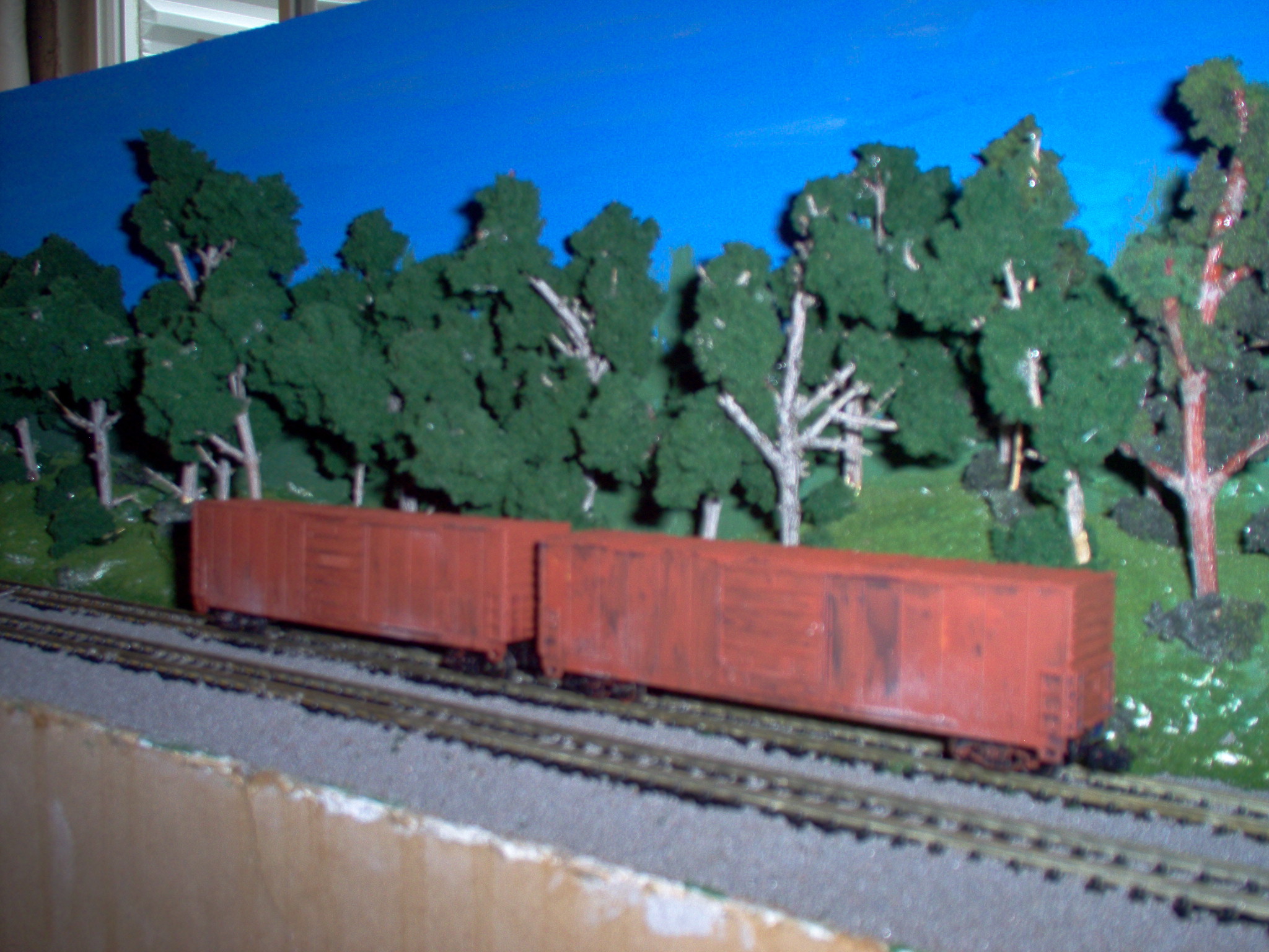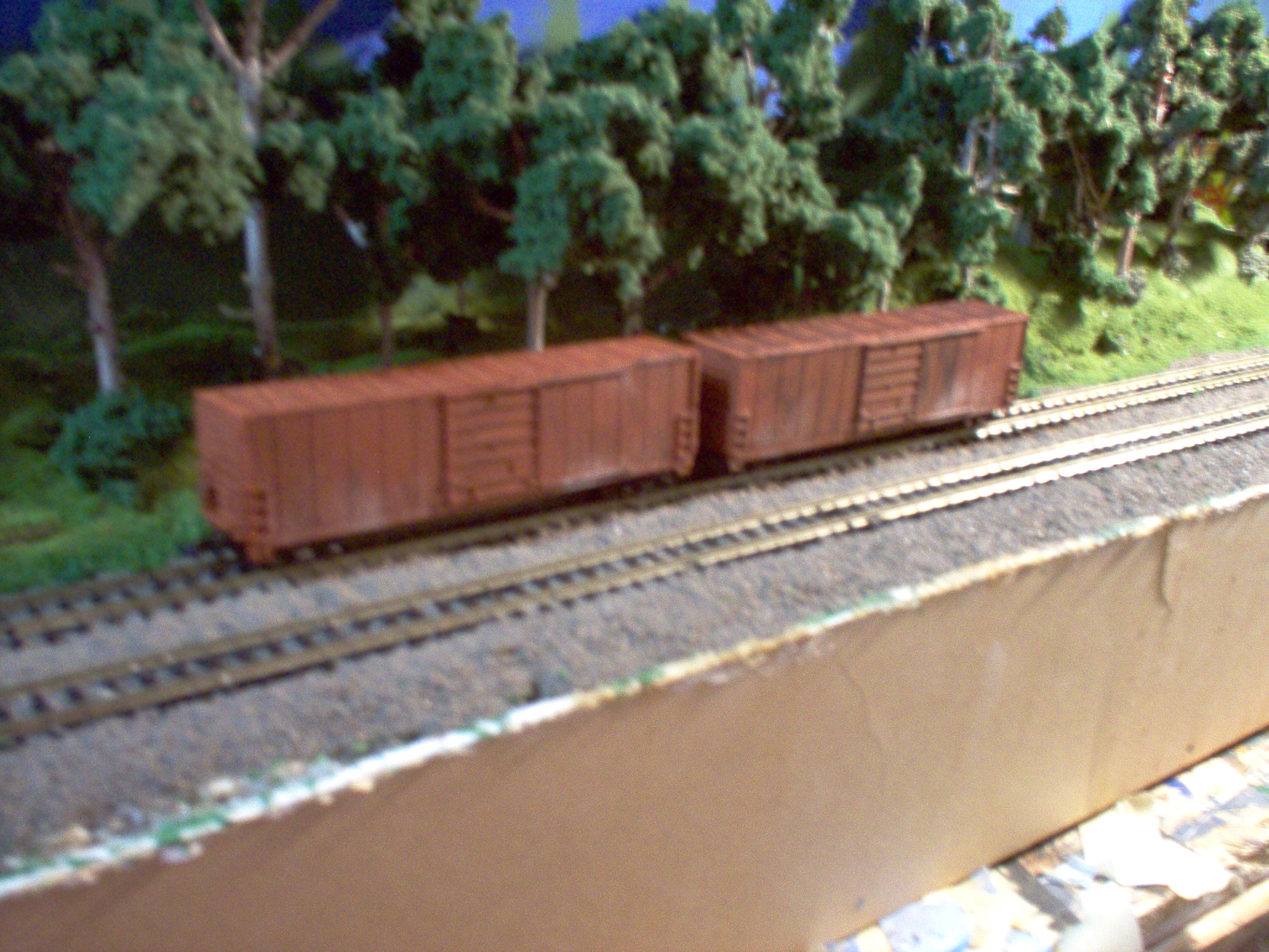 My Layout just got started a couple of months ago so its not very big yet but its turned out good so far. I built the table that it is built on entirely out of pieces I scrounged from construction sites. The basic plan I have for my lacout is that I want it too be a two track main line with loops on both ends to ensure continuos running. One of the loops will include sidings and will be my staging yard. My entire railroad will be in N scale even though I havce a whole basemenbt to build it in. The main reason for this is that I dont have alot of money or a job so I am relying on luck and myu allowence to supply me with the supplies I need. The land will be modeled after the spessart region of Germany because I've always felt a fascination for european trains and every timne I visited my grandma in Laufach/Fronhoffen Germany I always sat and watched the trains cruise through the beutifull countryside. Right now the only train I have in my layout is a santa fe highballer. Yes I know it doewsn't fit but it sure fits my budget. I plan on getting some modern electric European Trains from tyhe sweetest store in town, Discount Trains in Shops at the Bluffs. All the foilage on my layout is a dark green since the are I am modeling is in a very wet and rainy climate where the trees grow up to 4 times the height of a train or more.